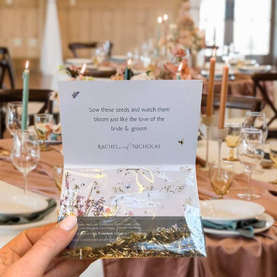 We had personalised wildflower packets as our wedding favours. They were beautifully made by the team at connecting to nature. Our guests were really impressed by them. I think it is a lovely reminder for people of our wedding day to have these flowers blooming in their garden.
